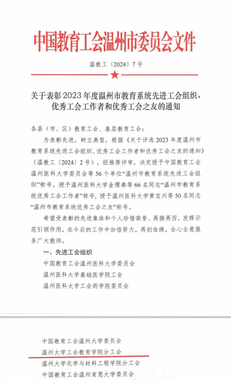 近日,中国教育工会温州市委员会印发《关于表彰2023年度温州市教育系统先进工会组织、优秀工会工作者和优秀工会之友的通知》(温教工〔2024〕7号)。温州大学工会日本最新av 分工会被评为温州市教育系统先进工会组织!