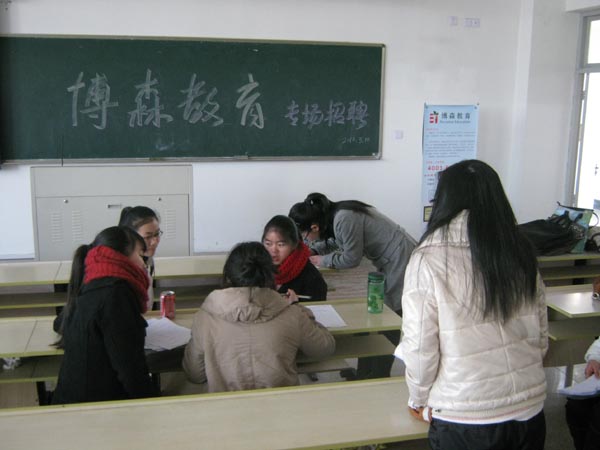3月10日下午,温州市博森教育培训机构来日本最新av 招聘师范类毕业生,招聘现场设在北校区3-402教室,来自全校各师范专业以及部分在读硕士生参加了本次“教室招聘会”。据悉,招聘单位本次共为我校师范类毕业生提供15个工作岗位,招聘活动中共收到简历60多份。