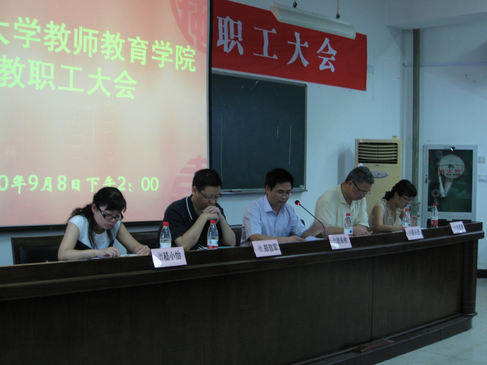 胡院长首先向全体教师汇报了学院暑期工作,并特别对暑期辛勤加班的老师们表示感谢。接着,胡院长对学院未来的发展指出了一下几点要求:一、抓紧学习《国家中长期教育改革个发展规划纲要》;二、加强管理队伍建设,在学科建设上加大力度,提升科研水平;三、重视学生专业思想教育,建立以班级为单位的考核制,创特色创品牌;四、发挥学院党组织的战斗堡垒作用,建立学习型党组织;五、加强学院文化及团队凝聚力建设,行政队伍要加强业务学习,提高综合管理水平。