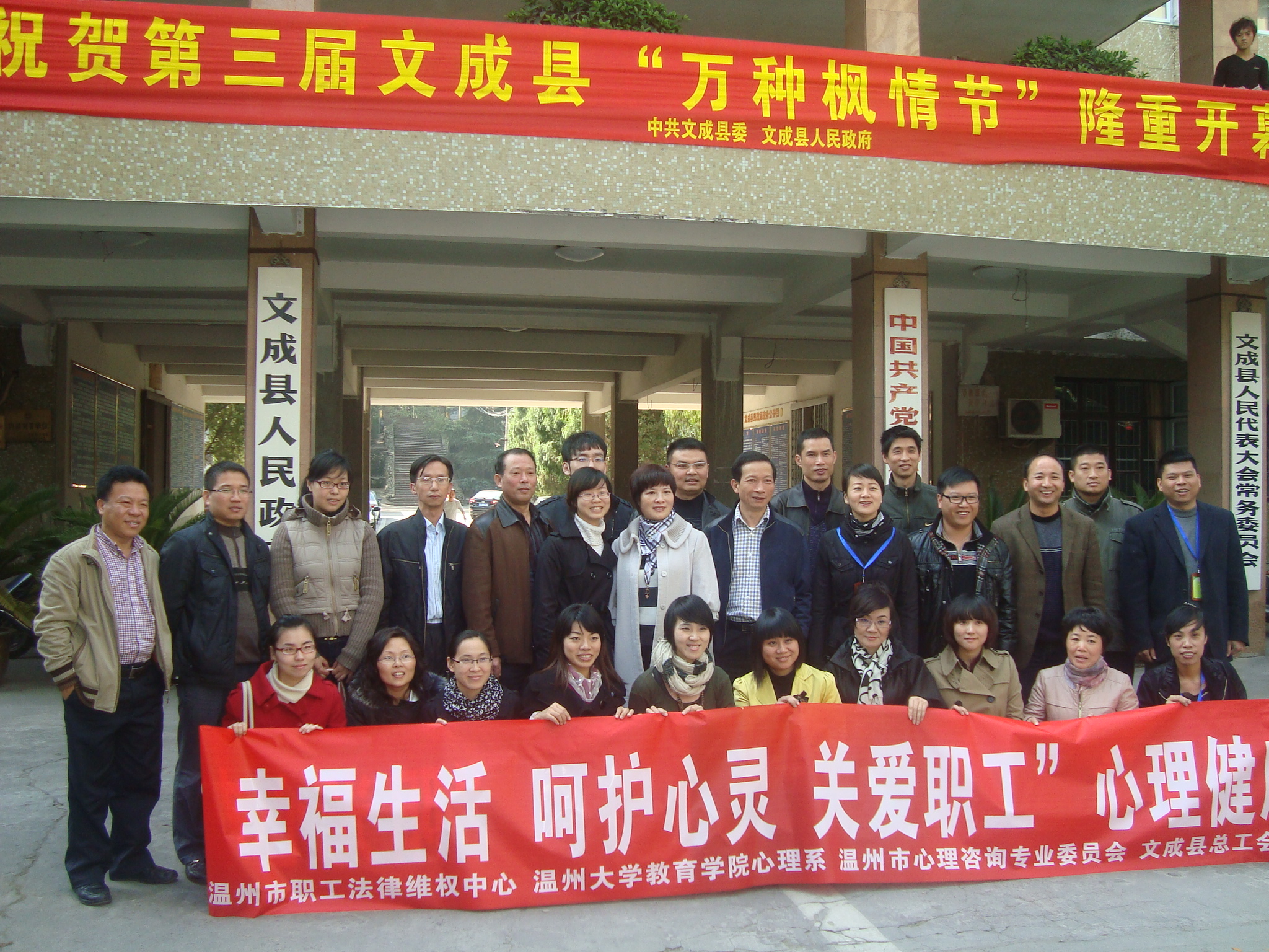 11月27日,日本最新av 心理学系与温州市职工法律维权中心、温州市心理咨询专业委员会,在文成县联合开展心理健康系列活动。市总工会、文成县总工会有关领导,市心理咨询专业委员会负责人及日本最新av 心理系盛建森老师参加了活动。