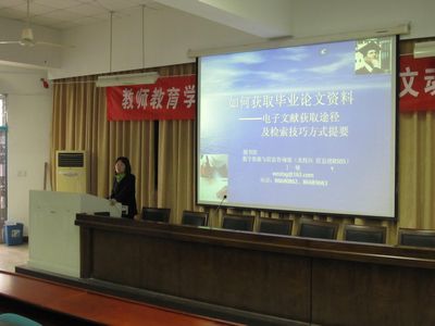 随后,图书馆数字资源与信息咨询部的丁一敏老师就毕业论文的文献检索作了生动详实的讲座。她从文献的基本概念、文献的种类以及文献资料的多种载体入手,多角度地讲述了如何利用我校图书馆的资源搜索文献资料。还结合多年专业工作经验,介绍了中国期刊全文数据库、中国学位论文数据库、博硕士学位论文数据库等几个主要数据检索工具的使用方法和技巧。