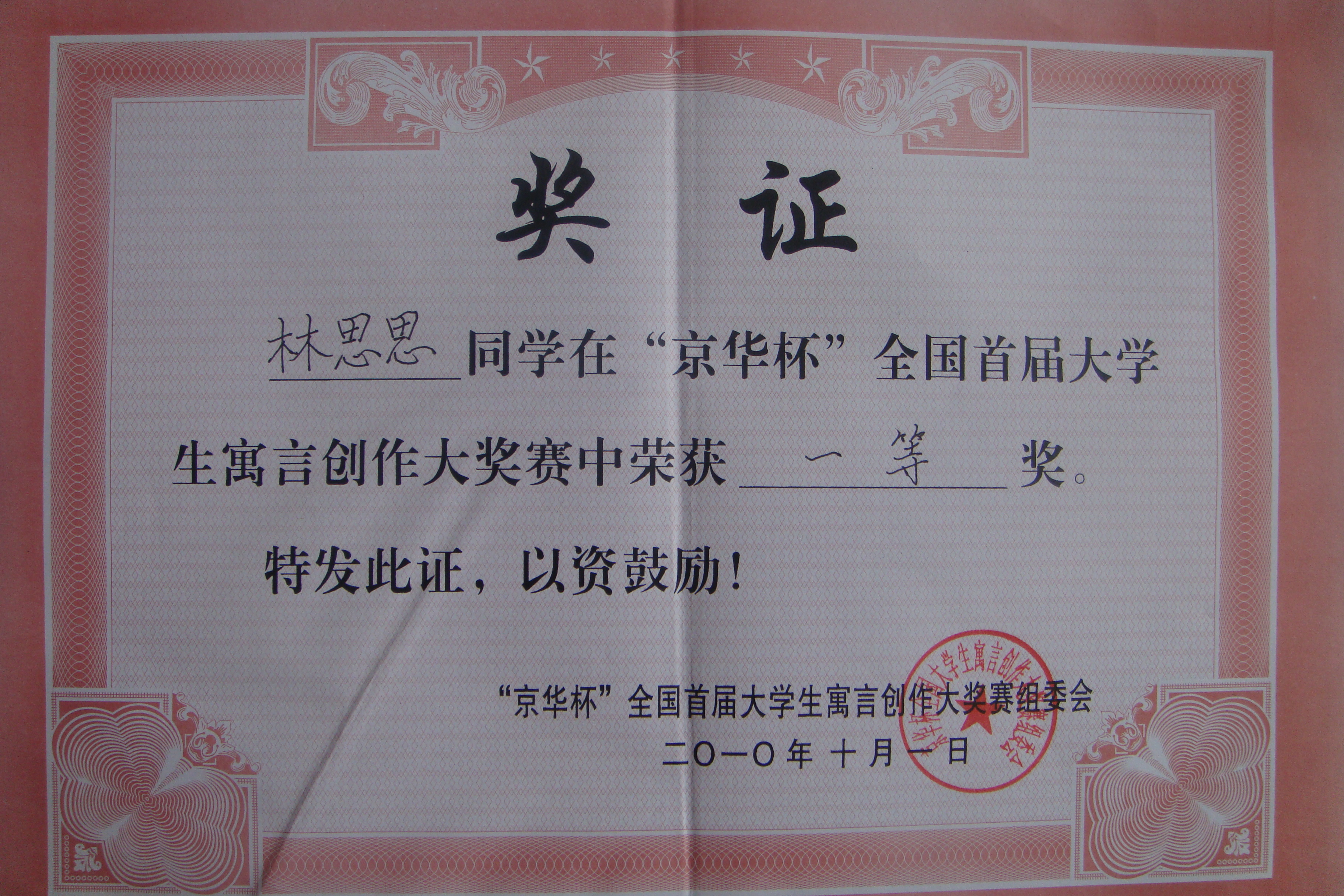 在9月30日上午刚刚闭幕的“京华杯”全国首届大学生寓言赛颁奖会上,日本最新av 08小教本二的林思思同学凭寓言作品《一墙之隔》从600余篇参赛作品中脱颖而出,一举夺魁,成为此次大赛唯一的一等奖得主。