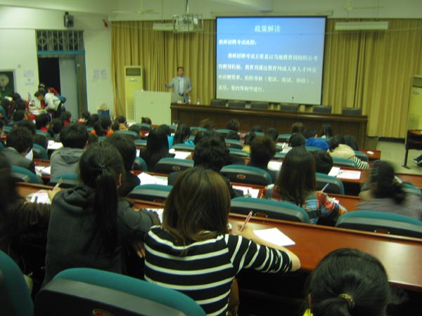 最后,曹教授还就2011年教师编制考的案例分析题,从课堂教学类、学生素养类、教师素养类、教育管理类、教育体制类等多方位进行详细解读,并着重介绍了教育写作及其考点和答题技巧。本场讲座结合地域特点,为特定学生群体进行专题讲座,受到了学生的好评与欢迎。