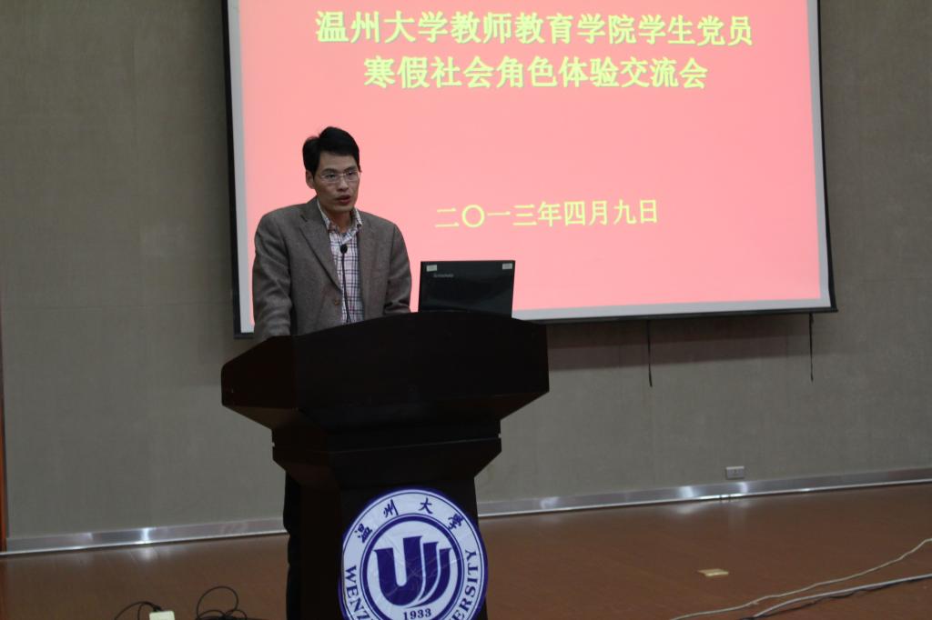 六位同学交流汇报结束后,校党委组织部副部长金庆良老师跟大家一起分享了自己的感受。首先他高度肯定学院开展的党员社会角色体验工作,他指出,开展社会角色体验是引导学生党员走出校门,走向社会,接触社会,了解社会,是向群众学习,培养锻炼才干的重要渠道,也是提升思想,锤炼党性,树立服务社会的思想的有效途径。同时,金老师就当前世情、国情、党情发生深刻变化的形势下,就加强新形势下党员发展和管理工作谈了三点想法。一是要强化质量管理。按照“控制总量、优化结构、提高质量、发挥作用”的原则,加强宏观调控,抓好党员发展规划,确保党员发展比例和党员规模更趋合理,党员队伍结构进一步优化;探索不合格党员退出机制,确保党员质量不断提高。二是要强化教育培训。创新党员教育方式方法,分级分类抓好教育培训;通过紧贴学生实际,不断探索和推广研究式、案例式、体验式、模拟式等培训方式,将远大理想、信仰信念提高到新高度。三是要强化社会实践。按照校党委2012【51】号《关于进一步加强与改进大学生党建工作的实施意见》,结合专业特长和兴趣意愿,广泛开展社会调查、生产劳动、志愿服务、公益活动、科技发明和勤工助学等社会实践活动,引导大学生党员在社会实践中受教育、长才干、作贡献。
