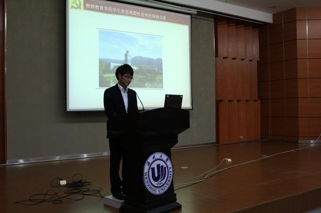 6位学生党员与大家分享了他们在寒假期间的角色体验。陈京京同学体验的是支教教师这一角色,她联系自己寒假参与广西支教志愿服务的体验经历,呼吁广大同学们关爱、关注贫困山区留守儿童,为支持我国农村教育事业贡献出自己的力量,积极参与到“大学生志愿服务西部计划”中来。徐玉华同学体验的是超市收银员工作,收银员工作的严谨性、规范性,使得这份职业充满了挑战,而同事之间的相互关心,又使这份职业体验充满了温暖。朱文婷同学体验的是学校食堂工作人员这一角色,她回顾了这一周的艰辛与不易,她倡议同学们要珍惜人民群众的劳动成果,厉行节俭,拒绝浪费,参与到“光盘”行动中来。骆利锋同学体验了建筑工人的艰辛生活,建筑工人干着最累的活,拿着很少的工资,却用双手创造出了一幢又一幢雄伟的建筑。他们因为破旧的穿着、物质的贫乏,不被社会所重视。骆利锋同学以他的工友故事为例,号召大学生们尊重每一份职业。吴银选同学体验的是敬老院护工的角色,从她温柔细腻的声音当中,我们感受到了老年人的孤独与无奈,关爱父母、关爱老人就是关爱自己的未来。林敏敏同学体验的是家电售货员的工作,在她娓娓道来的讲述中,在场听众们了解了如何运用消费心理学做好推销,感受到只要你踏实、努力,三百六十行,行行能出状元。