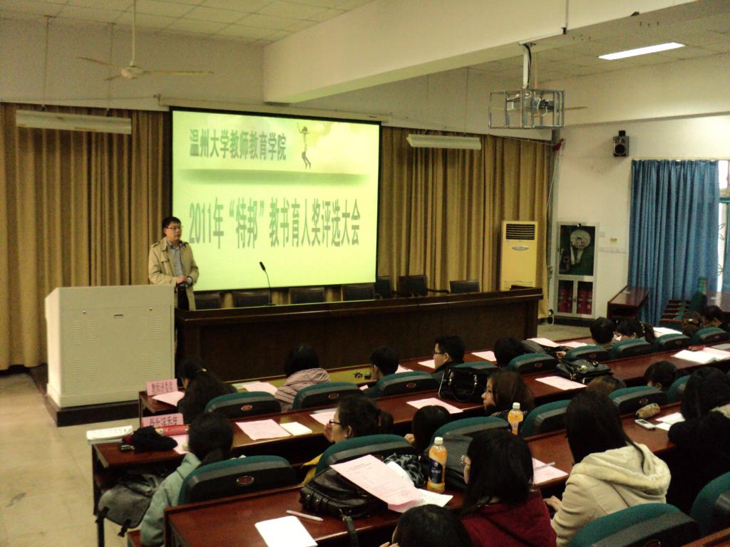 2011年“特邦”教书育人奖评选活动在教育楼隆重举行,蔡联群、郑信军、孙芙蓉、嵇小怡等学院领导、各系主任书记以及全院各班长组成评委团进行投票,评选产生章园园、朱伟、张新3名老师获此殊荣。