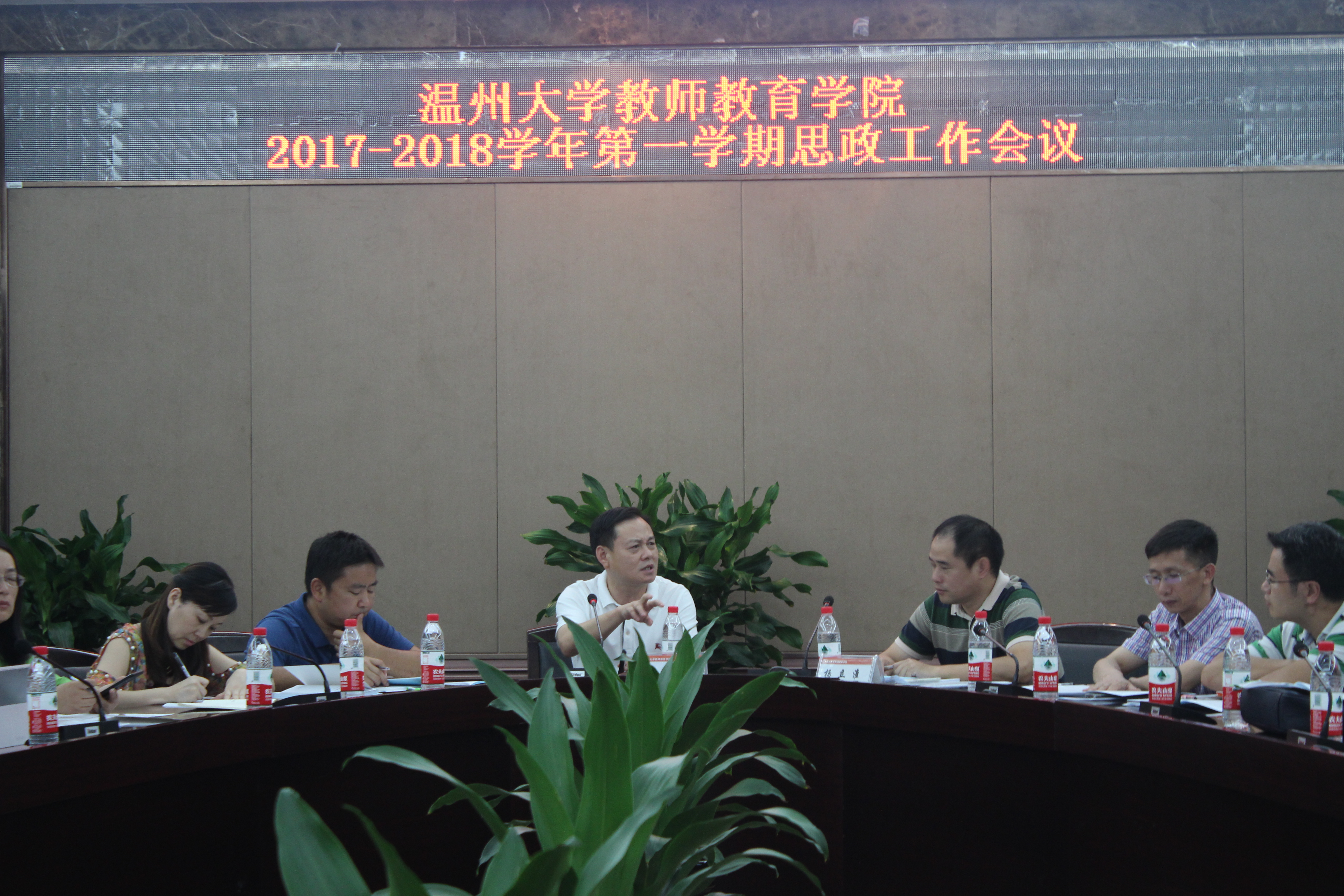 会上,学院党总支书记杨立淮向在座每一位思政工作者传达了温州大学思政研讨会的会议精神。之后,就习近平总书记“7.26”讲话精神,为与会老师作了《高举中国特色社会伟大旗帜决胜全面小康社会的行动纲领》专题辅导报告,强调每位思政工作者都要以学习贯彻落实习近平总书记重要讲话及全国、全省高校思想政治工作会议精神为主线,增强“四个意识”,强化党建引领,以立德树人为根本,以全员育人、全程育人、全方位育人为抓手,认真推进课程思政建设工作,发挥哲学社会科学育人功能,将思想引领和价值观塑造融入课程教学,充分挖掘和运用各类课程的德育元素和德育功能,发挥专业教师的育人作用。积极依托学区制教育管理的平台与优势,发挥协同育人功效,深入推进学院大学生思想政治教育工作,努力建设一支高素质的思想政治工作队伍,为学院人才培养的中心任务保驾护航。