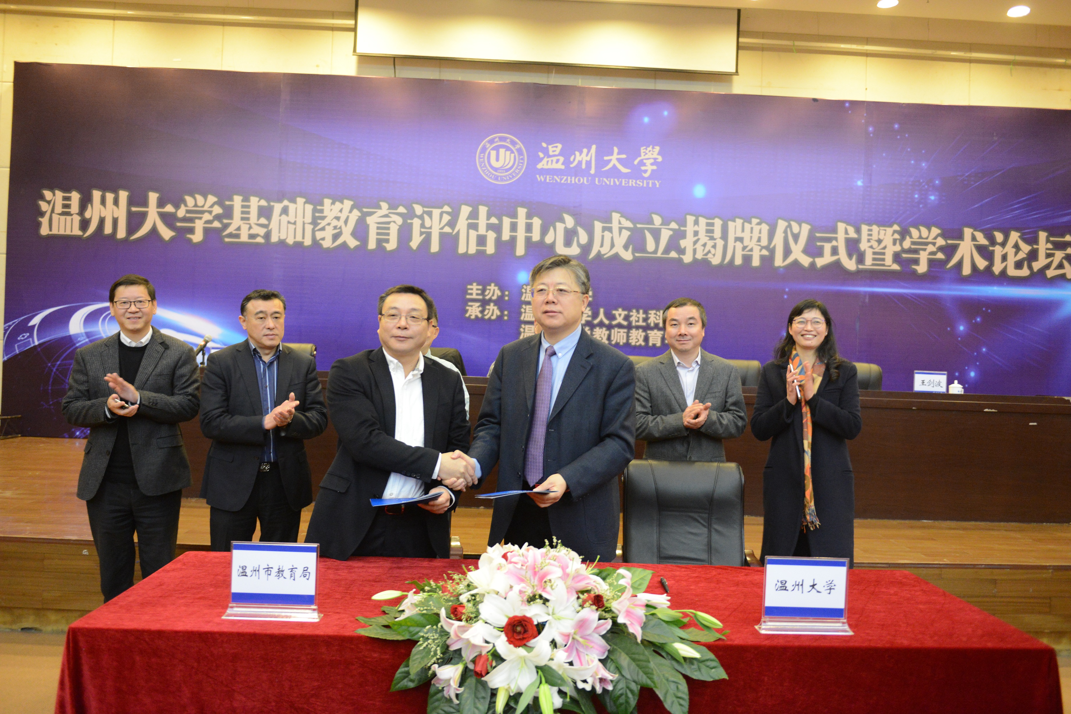 在热烈的气氛中,郑建海局长与李校堃校长分别代表温州市教育局与温州大学签订了基础教育评估战略合作协议,并共同为温州大学基础教育评估中心揭牌。