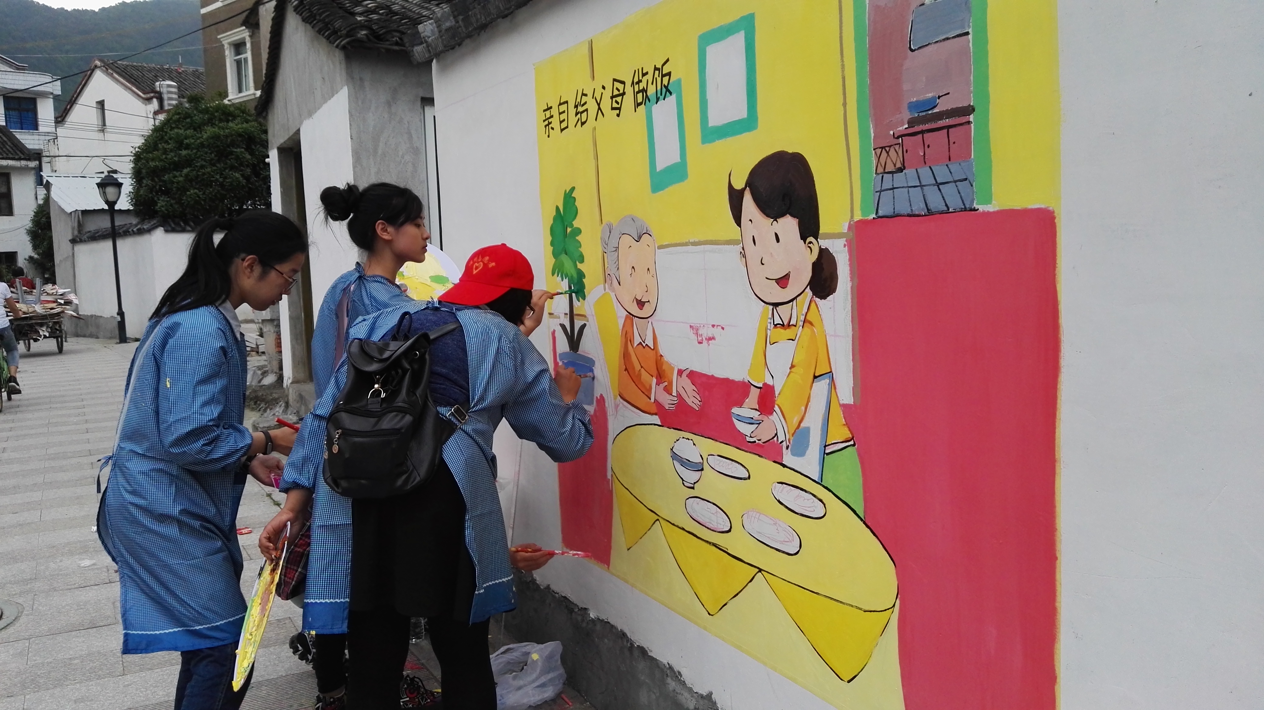 美术工作坊指导老师陈铿和学生科严晓秋老师带队,30余位学生志愿者,前往乐清虹桥镇大乌石村开展公益墙绘活动。