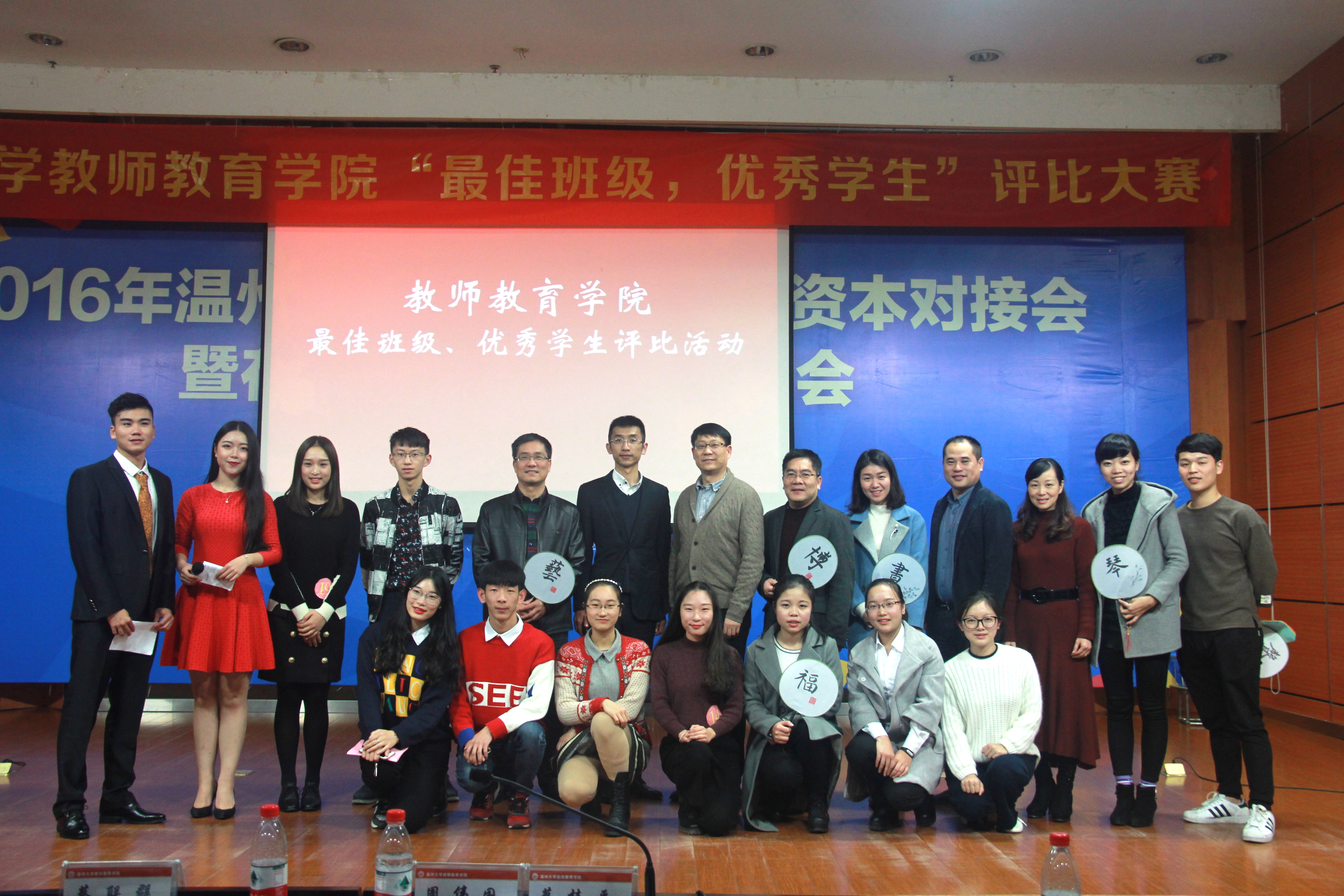为响应学院的优秀学风建设,2016122118时整,温州大学教师日本最新av 在南校雁山厅举行了最佳班级、优秀学生评比活动。温州彩虹堂艺术学校董事长董衍滔、温州大学学生处处长蔡联群、就业处处长周伟国、团委书记屠霁霞、教务处副处长蔡桂平、教师日本最新av 党总支书记杨立淮,党总支副书记杨丽君,以及教师评委出席本次活动。各班级代表也到场加油助威。