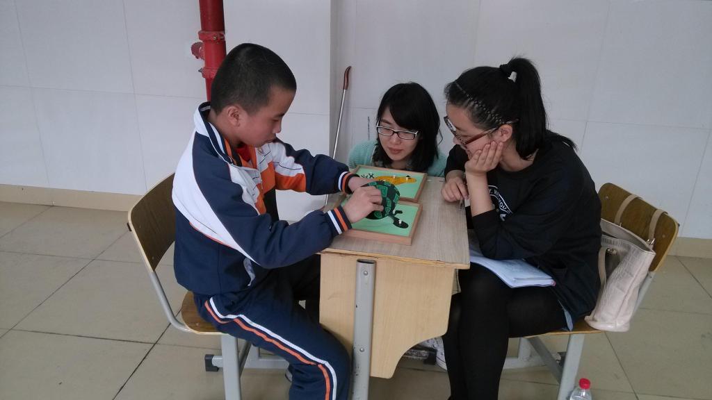 本次测试的对象是特殊儿童,主要包括自闭症儿童和智障儿童。我们这次所选用的测验是PPVT和瑞文推理测验联合型,两个测验均为非文字测验,适合对特殊儿童进行测试。PPVT可供2.5岁到18岁的儿童使用,测量言语有困难的人及聋人的词汇使用能力,是目前美国智力落后协会(AAMD)所使用的一种常用智力测验工具。瑞文推理测验联合型可供5岁到75岁的人使用,主要测量推理能力。我们分别在6个教室对孩子们进行测试,每个教室3组。因为测试的对象是特殊儿童,所以每2个成员测试一个特殊儿童,一个用生动清晰的指导语向儿童施测,另一个在一旁观察记录每一位儿童答案及做题状态。由于测试对象的特殊性,有些孩子还是不能很好地配合,往往使得测试无法顺利进行。于是我们就会采取各种措施,尽力使孩子们能进行测试。如果实在不行顺利进行测试的,我们也会和孩子们做游戏,使孩子们开心。在整个测试过程中,各个小组认真负责地进行测试,而陈老师除了指导、组织、协调各个小组测试外,还积极主动地和老师或家长进行沟通,了解特殊儿童的心理行为及矫治方法。