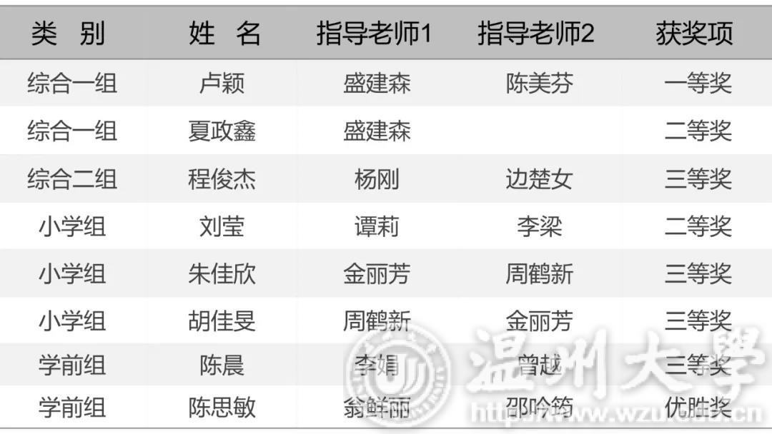 本次竞赛共有九个组别,日本最新av 学子参加综合一组、综合二组、小学组、学前组四个组别的比赛,共获得1个一等奖,2个二等奖,4个三等奖,1个优胜奖,其中心理专业实现了历史性突破。以下为具体获奖情况: