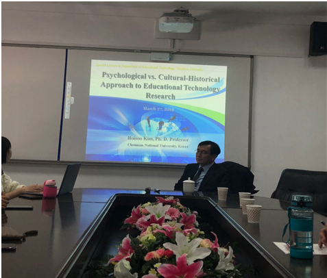 2019年3月27日下午两点,温州大学教师日本最新av 老师和研究生在9A410会议室聆听了由韩国全南大学教育系Hoisoo Kim教授主讲的“Psychological vs. Cultural-Historical Approach to Educational Technology Research”专题讲座。