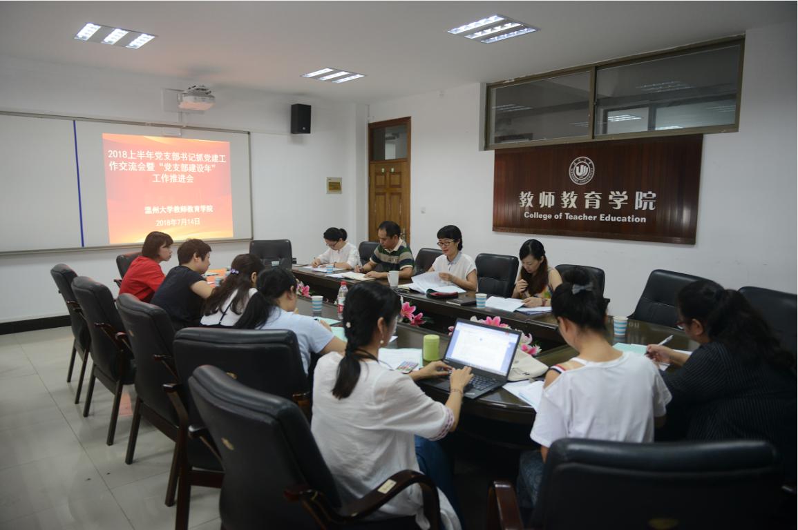 杨立淮书记最后总结发言。他传达温州大学2018年上半年党总支(分党委)书记抓基层党建工作交流会情况,传达《中共教育部党组关于高校党组织“对标争先”建设计划的实施意见》《中共教育部党组关于高校教师党支部书记“双带头人”培育工程的实施意见》《2018年温州大学党委书记抓基层党建工作任务清单》等文件精神,要求各支部书记对照教育部和学校文件,充分认识基层党建工作的重要性继续推进“党支部建设年”各项工作,结合平时工作,做好书记项目的建设与结题工作,做好假期“两学一做”常态化制度化工作,高质量落实基层党建工作任务,夯实基层党建基础,推动事业发展。
