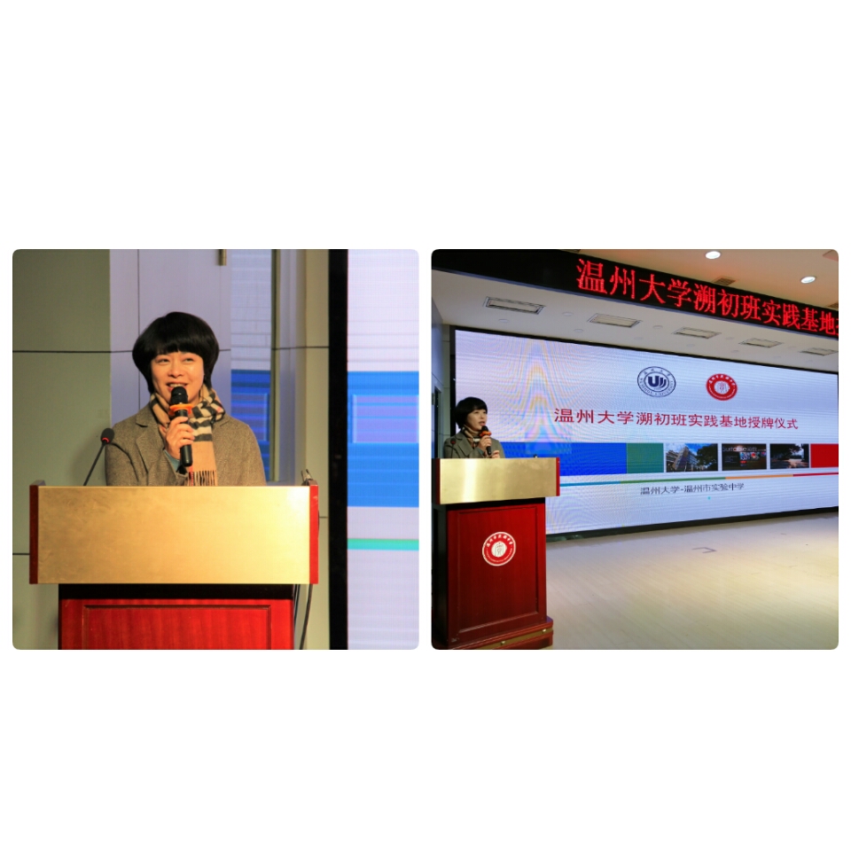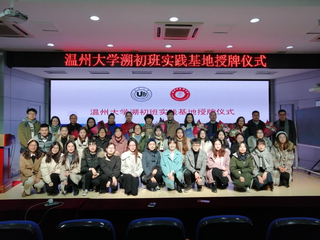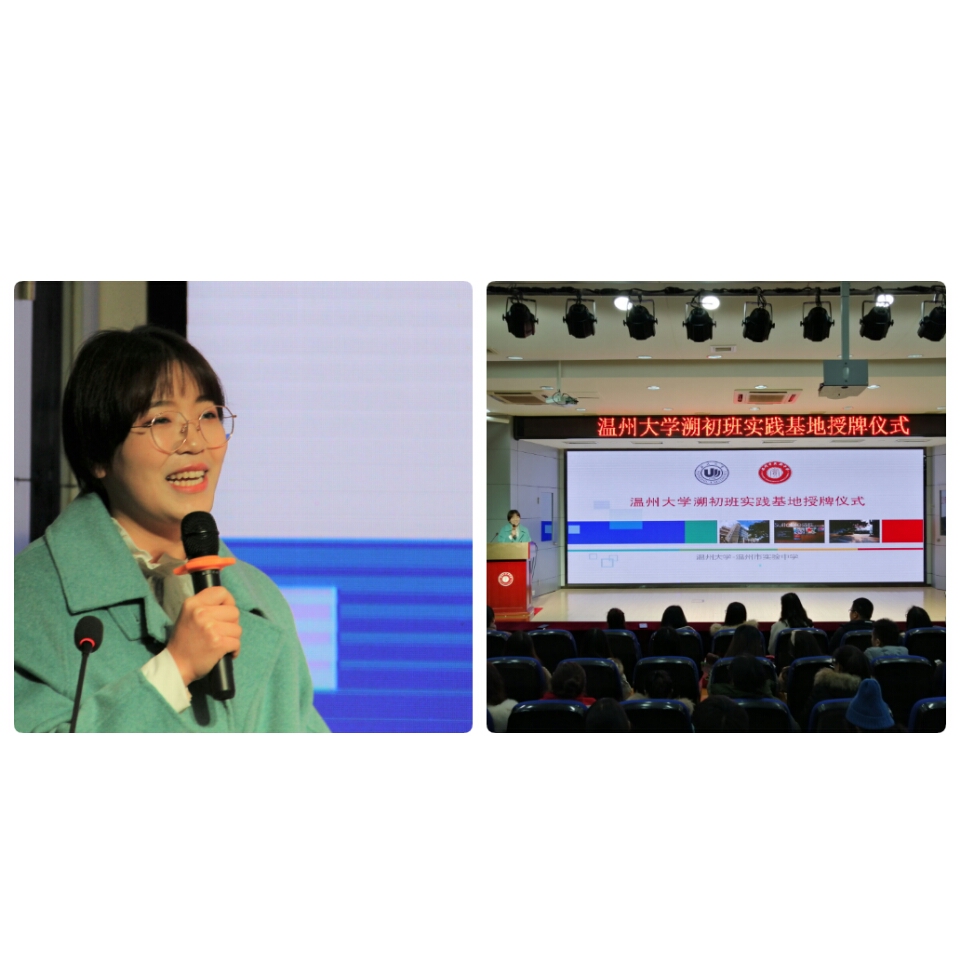 12月28日下午,温州大学教务处副处长胡瑜、温州大学教师日本最新av 副院长彭小明、温州大学教师培养基地办公室主任朱伟老师、第十期溯初班班主任金丽芳、溯初班管理工作秘书金荣乾以及第十期溯初班全体学员前往温州市实验中学参加“温州大学溯初班实践基地”授牌仪式,温州市实验中学校长倪彤、副校长黄慧以及溯初班校外各专业实践导师们共同参加本次活动。温州市实验中学教师发展处主任何倩主持本次活动。