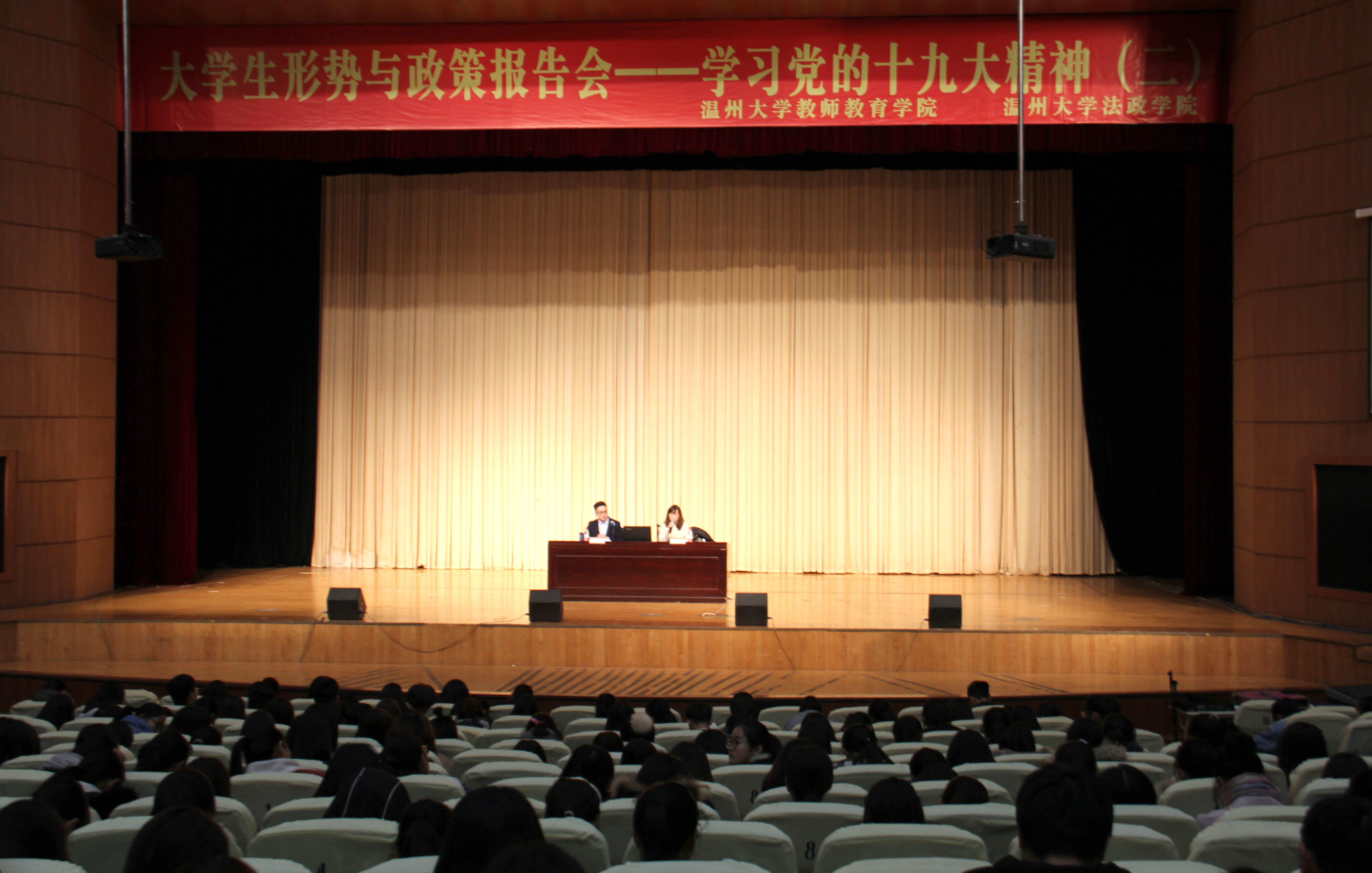 为了响应十九大精神,营造更好的法治教育环境和氛围,近期,温州大学教师日本最新av 与温州大学法政学院在育英大礼堂联合举行“大学生形势与政策报告会——学习党的十九大精神”主题报告会。十九大报告中,习近平总书记用“民主法治建设迈出重大步伐”这12个字,概况了这极不平凡的5年,我国推进全面依法治国取得的历史性成就。此次讲座由教师日本最新av 党总支副书记杨丽君主持,并且特别邀请到来自浙江人民联合律师事务所的项若非为同学解读十九大中的法律知识。