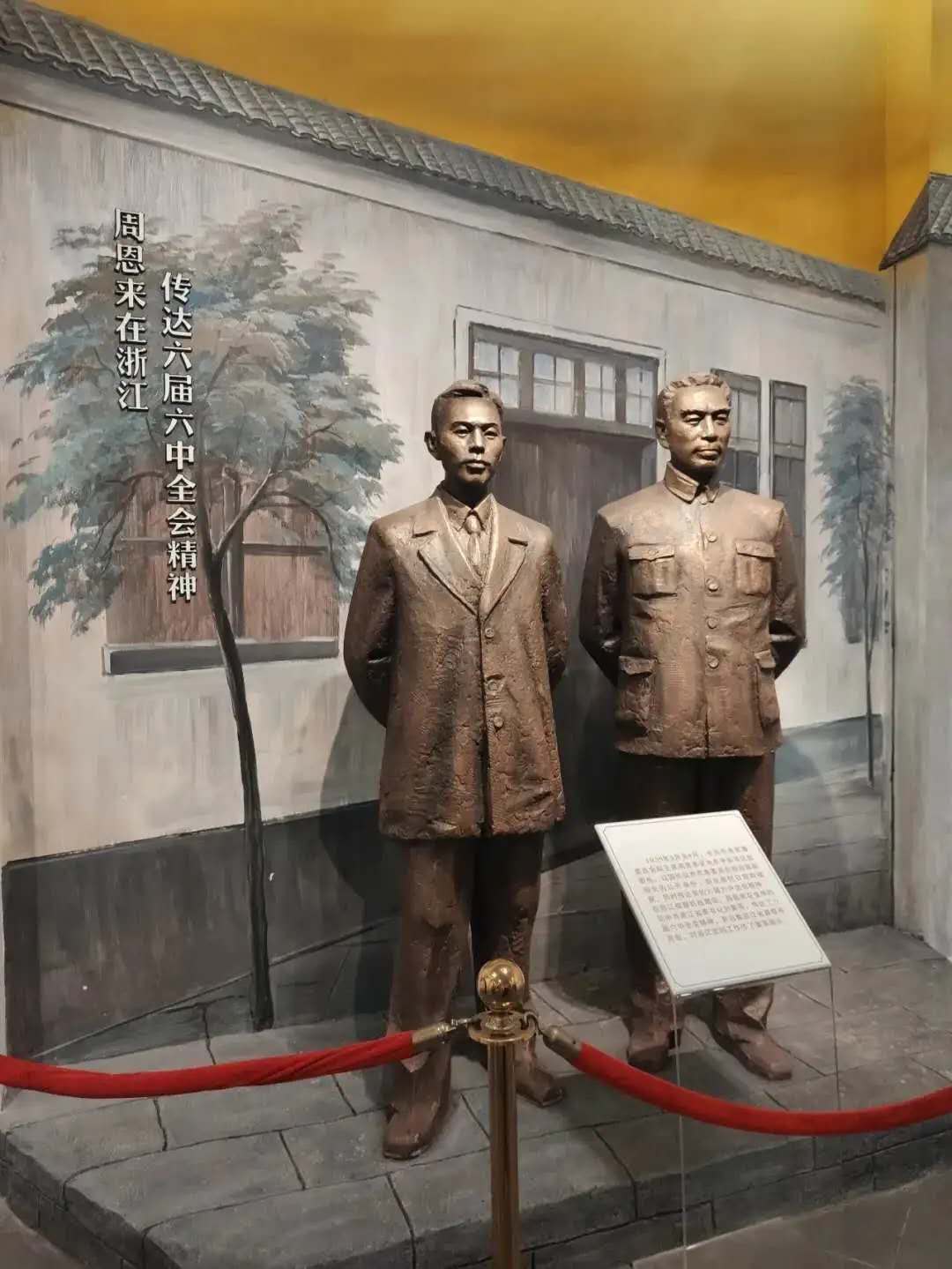 馆内各种人物雕像、模塑、建筑仿造模型……馆内的陈设让游客们切实地感受到当年条件的艰苦和红军坚定的毅力。其中一座雕像生动展示了周恩来总理与书记刘英的会晤的场景,其中周总理所传达的六届六中全会精神对浙江进行党的工作起到了至关重要的作用。省一大场所布置虽简陋,但却是冠尖会场,在这里,浙江省委书记刘英作了大会的政治报告。