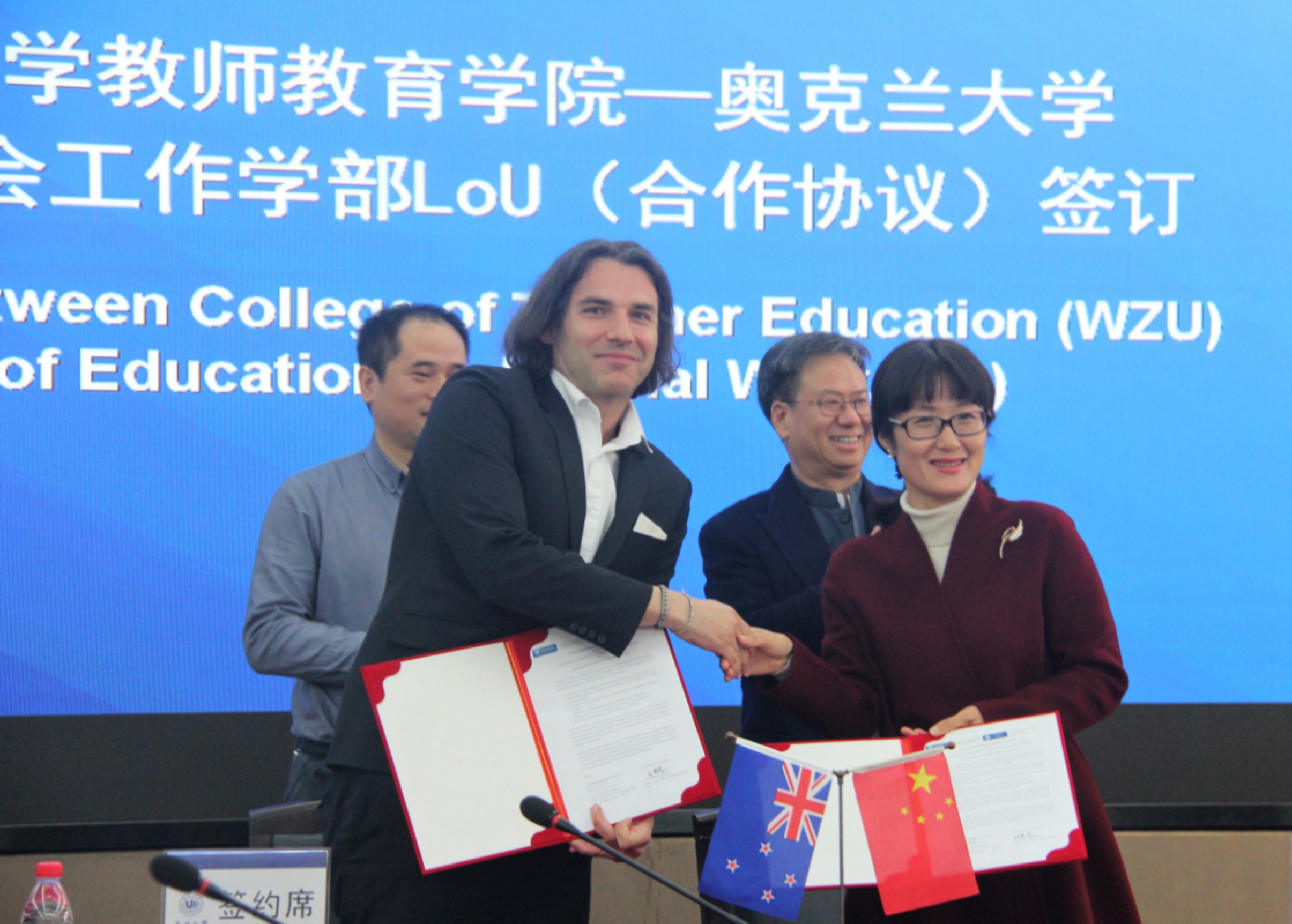 与奥克兰大学教育与社会工作学部签订了合作协议,敦聘新西兰奥克兰大学Dr.MarekTesar为客座教授,并由孙院长向Dr.MarekTesar颁发聘书。