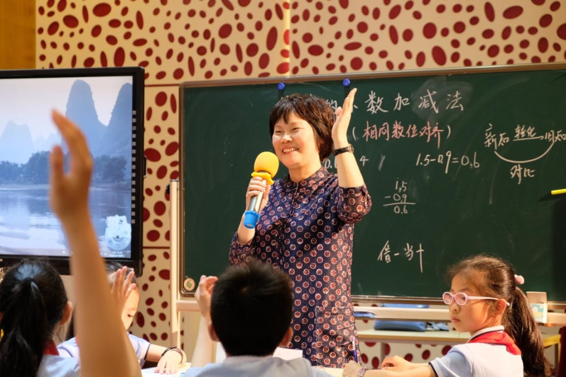 温州市实验小学苏娜老师以学生前测的0.2+0.5 0.8+0.6 1.5-0.9 25.7-1.3 4.7+6五道题目展开教学,通过解释0.8+0.6为什么等于1.4而不等于0.14理解简单小数加减法的算理。课堂上学生的发言精彩纷呈:有运用元角分知识、长度单位、利用整数笔算迁移到小数笔算,有利用小数的意义来理解的。最后通过运用计算方法解决4.7+6从而突破难点。她的课让现场的老师深深感受到什么样的课才是真正以学生为中心的课堂,大气、开放、灵动。课后现场打分,全班孩子对苏老师给出了满分五分的好评!