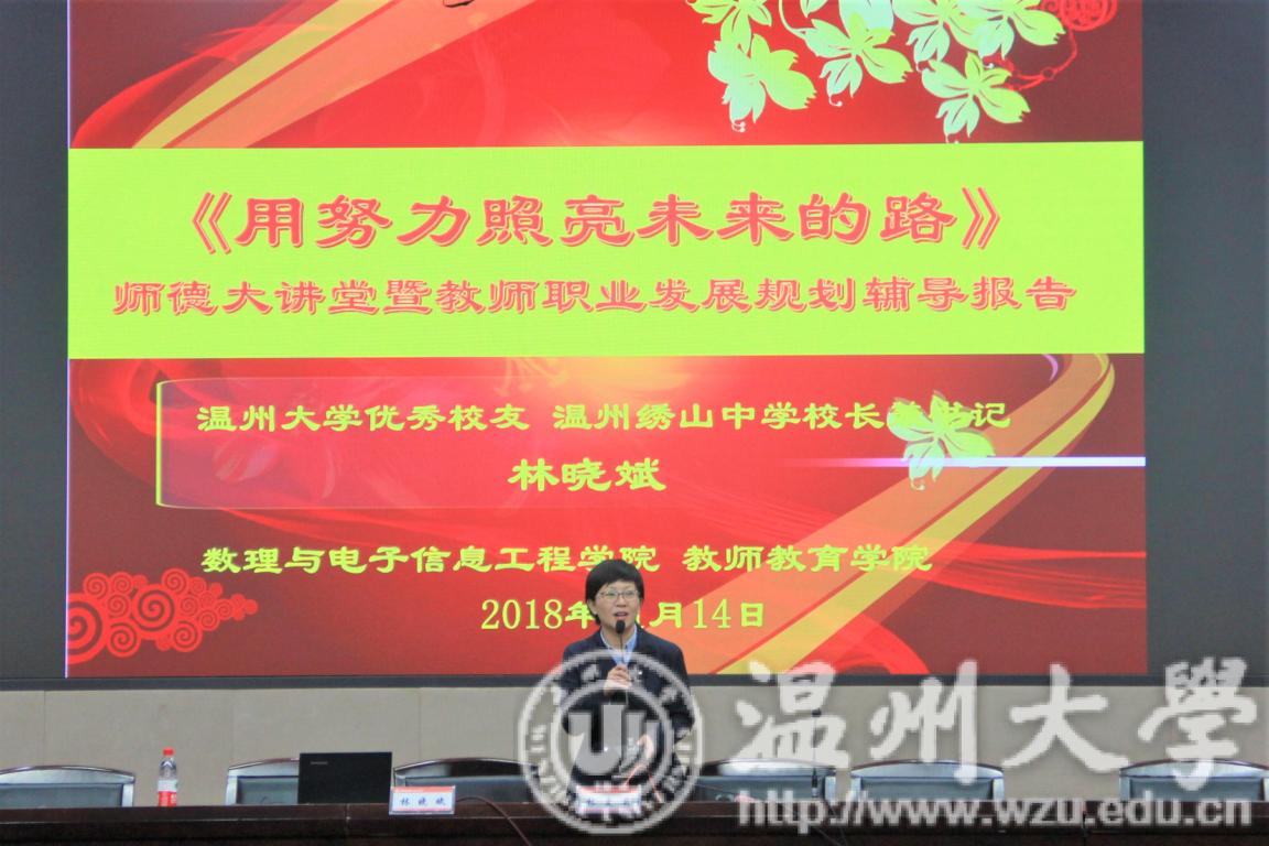 11月14日晚,温州大学岩松堂雁山厅开展了以“用努力照亮未来的路”为主题的师德大讲坛暨就业规划辅导报告会。本次讲坛由温州大学优秀校友、温州大学特聘就业顾问、现温州绣山中学校长兼书记林晓斌老师主讲。数理与电子信息工程学院党支部书记林爱菊、教师日本最新av 党委副书记杨丽君以及数电学院和教院的部分学生参与本次活动。本次活动由林爱菊书记主持。