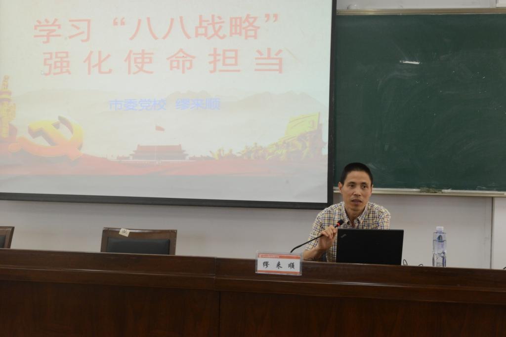 为深化教职工对“八八战略”的理解和把握,提高政治理论水平,会议邀请温州市委党校科研处副处长、市四个一批人才缪来顺教授做《学习“八八战略”,强化使命担当》专题讲座。缪来顺教授从“八八战略”的内涵与提出背景、“八八战略”的历史性成就与再深化和“八八战略”体现的的价值观与方法论三个方面对“八八战略”做了深入解读。