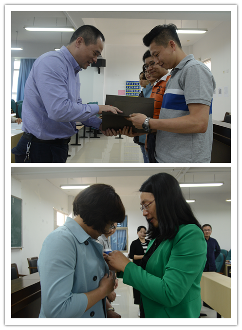 学院举行了新教师入职仪式,这项活动将作为学院加强师德师风建设的举措固定下来。2018年,学院新进沈钰澄、吴舒静、李政和、王文娟四名教师。杨立淮书记向新教师送上了校情院情介绍、学校教师职业规范要求资料、联络服务卡等“三件套”,并请新老师所在系的各位领导为他们佩戴上“温州大学”鲜红的校徽,以此表达学院对新老师们的热烈欢迎,希望他们在温州大学严守师德规范,教书育人,安居乐业,与学院师生一起共创美好明天。
