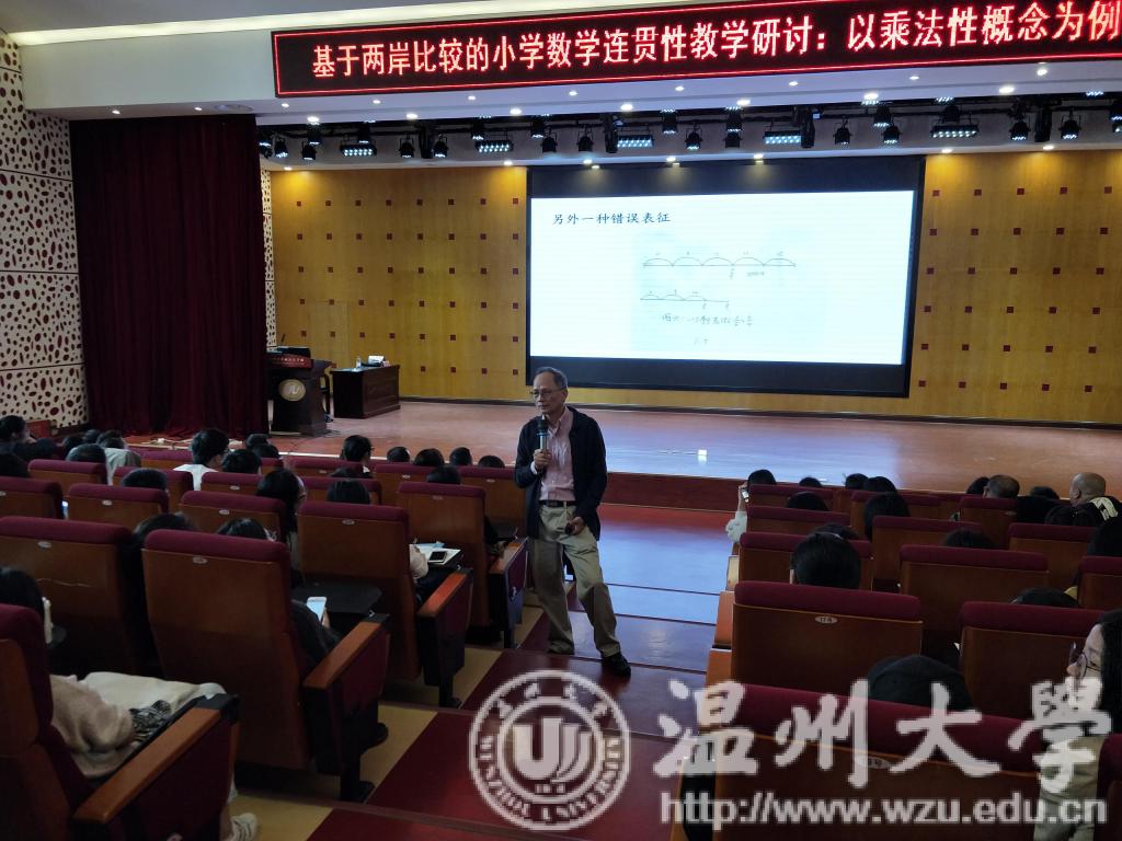 10月24日下午,台湾国立嘉义大学刘祥通教授在温州大学附属小学报告厅就《基于儿童思维,拓展学生数学能力》这一议题开设讲座。本次讲座为基于两岸比较的小学数学连贯性教学探讨的一个环节。温州大学17级小教系的全体同学聆听了本次讲座。