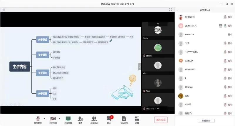 活动伊始,孟尧从复试、调剂、温大、读研四个角度切入与同学们分享了她在考研路上的经验和收获,她向同学们强调:“主动出击,提前沟通,扎实准备,机会总是偏爱有主动的人。”并就考研复试流程、调剂情况等方面的问题与大家进行了交流。
