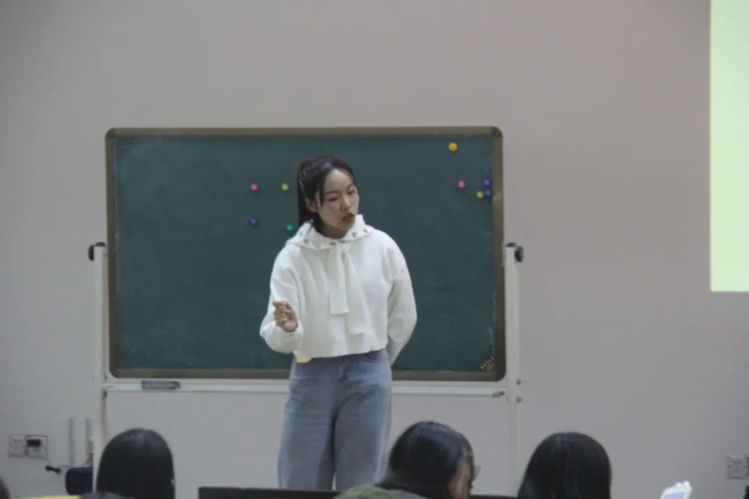 讲座伊始,林芬老师和同学们玩了个小游戏。林芬老师给出不同的颜色和颜色所对应动作,让同学们依次跟随音乐迅速配合做出指定动作,从而简单地测试了大家作为幼儿园教师所需的节奏感和颜色与动作的调配能力。