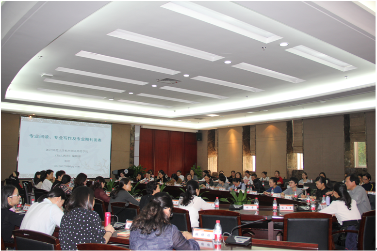 2017年10月28日下午,温州市教育局基教处陈苗副处长,鹿城区、龙湾区幼教干部应红华、陈芸芸和王茜茜,教师日本最新av 学前教育系书记陈旭微,副系主任杨婧、林琛琛,林炎琴、戴聪聪、曾国等教师十余人,部分本科生、研究生及温州地区十二个县市区共四十所省一级幼儿园园长齐聚温州大学岩松堂白鹿厅,聆听《幼儿教育》杂志主编张虹带来的题为“专业阅读、专业写作及专业期刊发表”的学术盛宴。