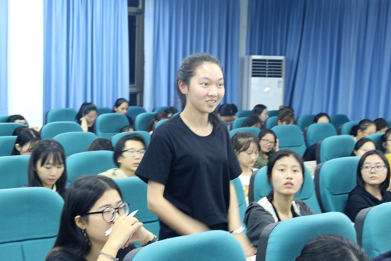陈苗副处长用“细心”、“爱心”、“耐心”三个词来总结,对于怎样成为一名专业的幼儿园老师,讲述了许多案例,如孩子们对于鱼体中鱼鳔作用的质疑,来证明幼儿园教师应具有自己的学科知识,包括科学、全面、专业三方面的知识内容,以适应教师和孩子思想认识上的不同,并读懂孩子的纯真;在引导幼儿自主表达和表现方面,她出示了幼儿画的孔雀都是开屏的图例,表明在教育过程中应给予幼儿亲身体验的机会,尊重他们的独特感受并支持他们的审美情趣和爱好。为了调动同学们的积极性,陈苗副处长特意增加了提问环节,以更好的解决同学们对于学前教育专业的一些困惑。