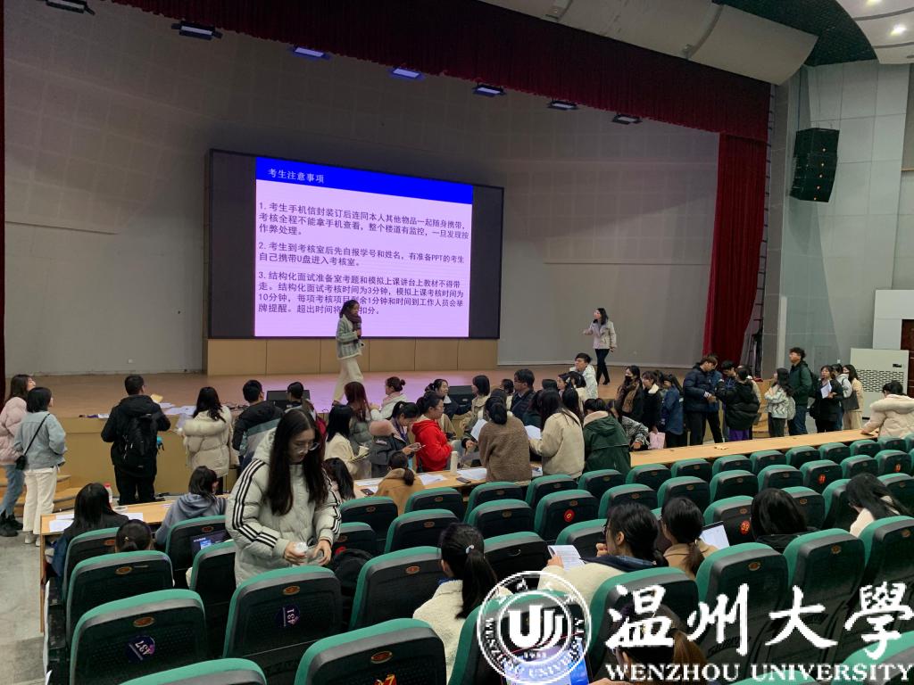 12月28日,在日本最新av 举行“结构化面试·模拟上课”项目考核,分设32个考场,由64位相关专业及部分校外指导老师担任了评委工作。日本最新av 林琛琛副院长、教师培养基地蒋金崇主任亲临现场指导考核工作。考生们严格遵守考场纪律及流程安排,认真准备,通过结构化面试和模拟上课展现了师范生的教学功底和综合素养。