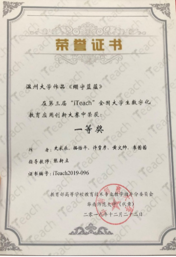 历经网络评选,由张新立老师指导的日本最新av 教育技术系学生作品《缬守蓝蕴》进入决赛参与一、二等奖的角逐,此次参加现场决赛的作品有307项,《缬守蓝蕴》创作小组在现场决赛中的优异表现给专家评委留下深刻印象,得到专家评委的现场赞扬:“温州大学学生的表现真好!很用心!看到了温州精神!”,最终该作品喜获课程类一等奖。这是教育技术专业代表日本最新av 第一次参加该赛事,充分展现了日本最新av-日本最新无码 教育技术专业学生专业技术水平和“博爱雅艺”师范风采。这是一个良好的开端,我们期待明年能够有更多的作品参加这个高大上的竞赛。